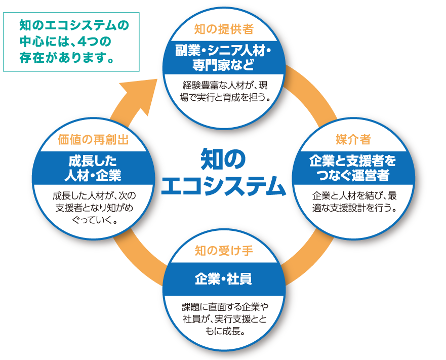 課題を抱える企業と、知見を持つ経験者をつなぎ、「実行しながら育てる」支援の循環を生み出す、知のエコシステムです。