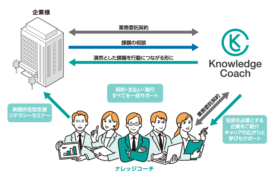 契約締結後は、運営会社が企業とナレッジコーチ双方の窓口となり、業務・支払い・連絡のすべてをサポートします。